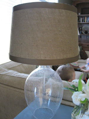 So my first burlap/shade project went ok, kind of a success but I wanted to try again. I have real issues with lamps and shades. It is hard enough finding a lamp I like and it usually never fails that the shade it comes with drives me crazy. I have had my best luck finding lamps at Pier 1. They are inexpensive, the shades come with them(unlike PB where you have to purchase the costly shade in addition to the expensive lamp), and they are versatile.